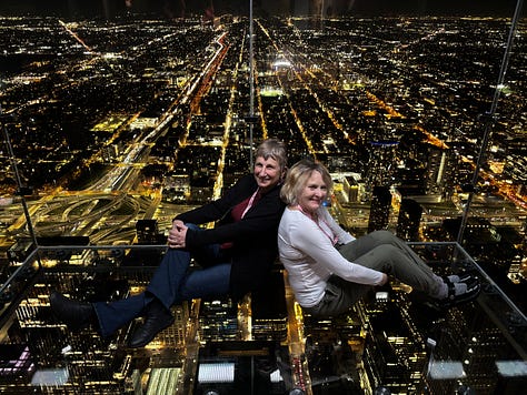 After a (rather) quiet arrival at the hotel, I scuttled to my hotel room, took Tylenol and did nothing more than move my lips in prayer. Two hours later - I was cured! I could speak and yelp and shriek over the SKYDECK with the rest of them. What a miracle! (Or it could be because a gal pulled out a martini shaker on the bus and made chocolate martinis that soothed their nerves and my larynx.)